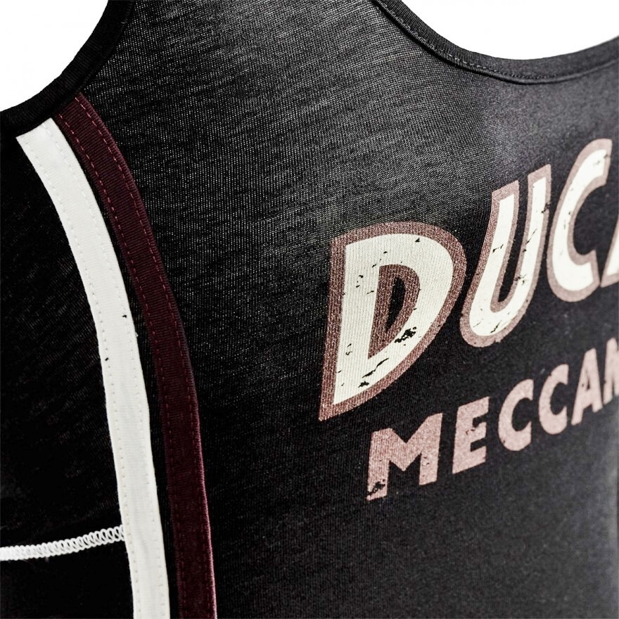 Auch im Sommer geht der Ducati Stil mit der Mode! Mit dem ärmellosen Shirt Meccanica kann jede Frau ihrer Leidenschaft für Ducati mit einem bequemen und vielseitigen Kleidungsstück Ausdruck verleihen. Das Shirt gibt es in schwarz und vintagerot. Es trägt auf der Vorderseite den traditionellen Schriftzug in Plastisoldruck, wodurch er noch deutlicher und strahlender wird, während sich auf der Rückseite im Nackenbereich das berühmte Logo mit den typischen "Flügeln" der fünfziger Jahre befindet.