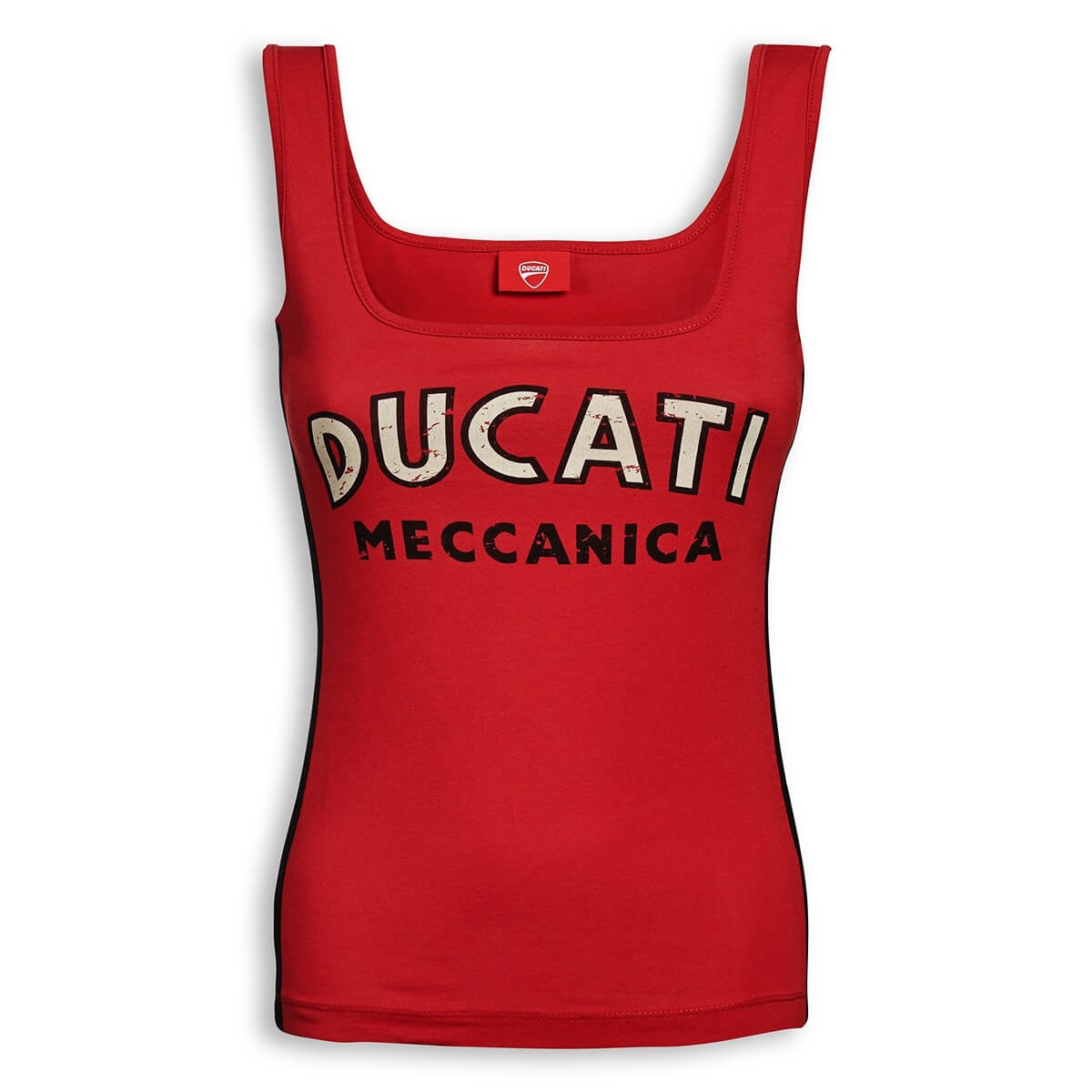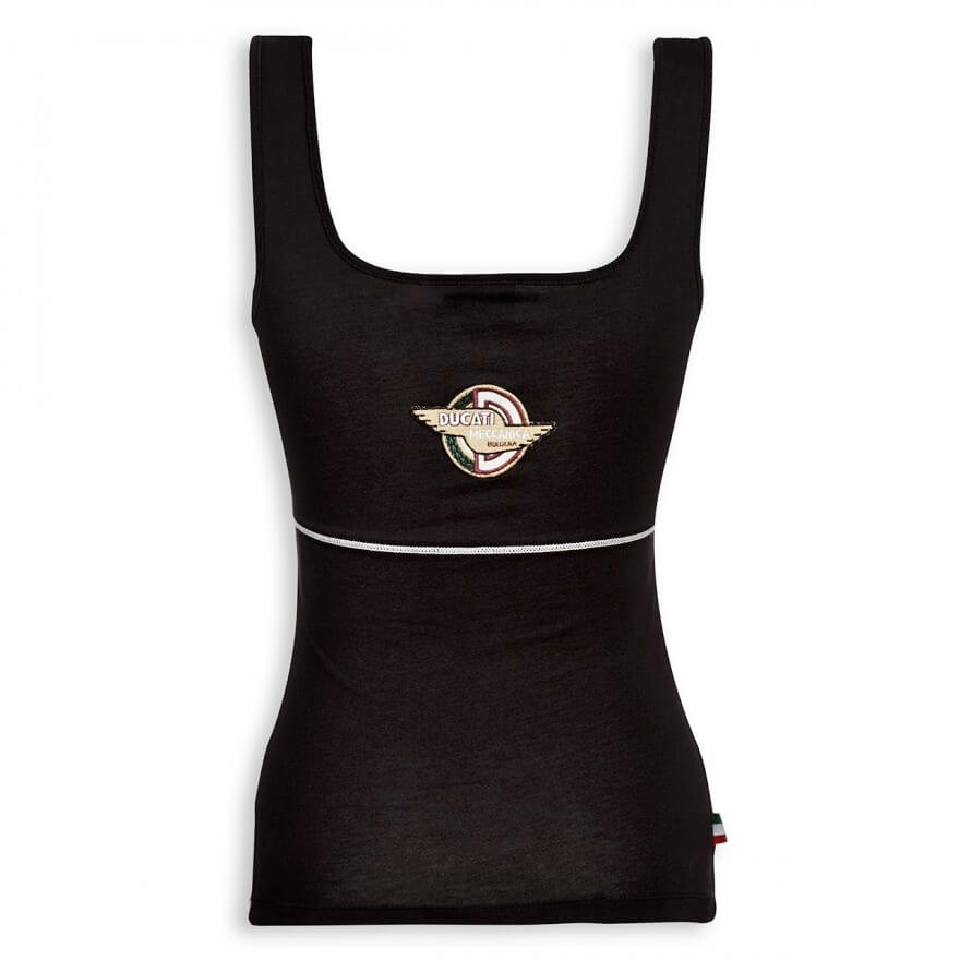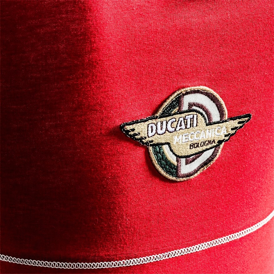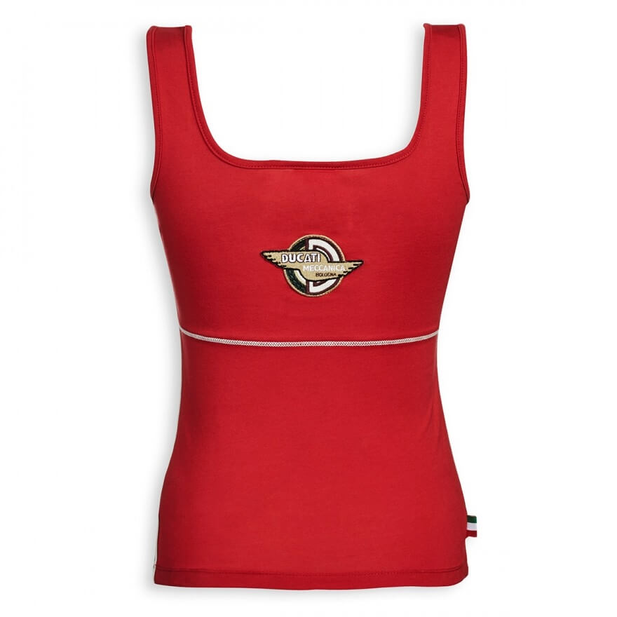 Auch im Sommer geht der Ducati Stil mit der Mode! Mit dem ärmellosen Shirt Meccanica kann jede Frau ihrer Leidenschaft für Ducati mit einem bequemen und vielseitigen Kleidungsstück Ausdruck verleihen. Das Shirt gibt es in schwarz und vintagerot. Es trägt auf der Vorderseite den traditionellen Schriftzug in Plastisoldruck, wodurch er noch deutlicher und strahlender wird, während sich auf der Rückseite im Nackenbereich das berühmte Logo mit den typischen "Flügeln" der fünfziger Jahre befindet.